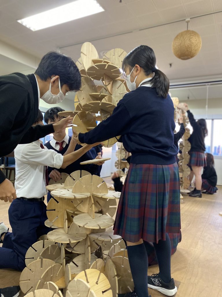⑤×藝術 ART AID for PEACE では、丸い板を組み合わせて「雨」や「みえないもの」などのキーワードから連想して形を作りました。