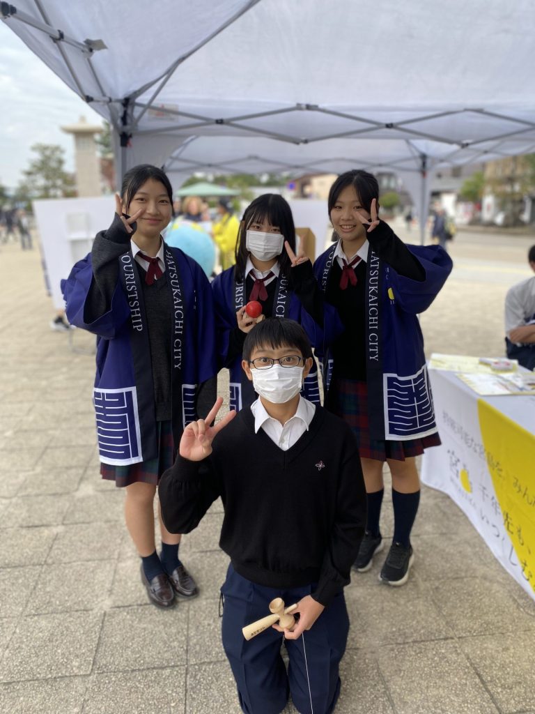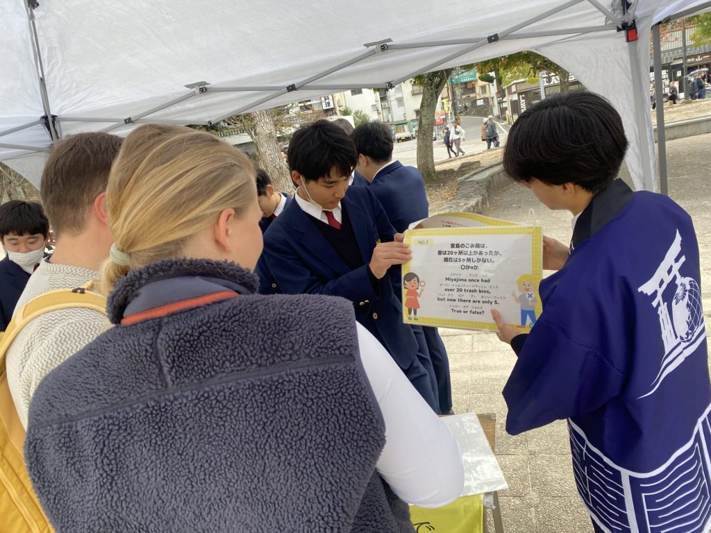 宮島では法被を着て、フリップクイズを使い訪日外国人の皆さんに宮島の歴史やルールなどを伝えました。