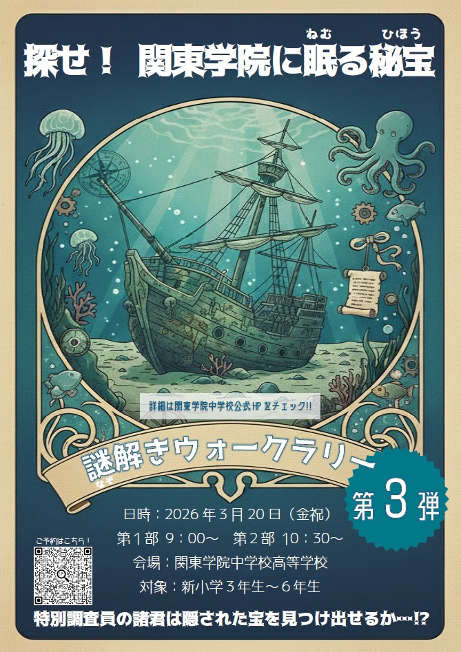 学校生活について <生徒企画>謎解きイベント開催! 2026.02.20 #2027年度 #謎解き #イベント #生徒企画 今年も開催いたします!この春,関東学院でトレジャーハント!? 前回も大変好評いただいた<生徒企画>謎解きイベントを今年も開催いたします。 生徒の運営するイベントHPのURLはこちら 3月20日(金祝)謎解き企画立ち上げメンバーからノウハウを引き継ぎ,新メンバーでみなさまを迎える準備をしています。絶賛予約中!ぜひ謎解きゲームを楽しみながら学校探検をしてください! イベント予約はこちら 前の記事 一覧へ 次の記事